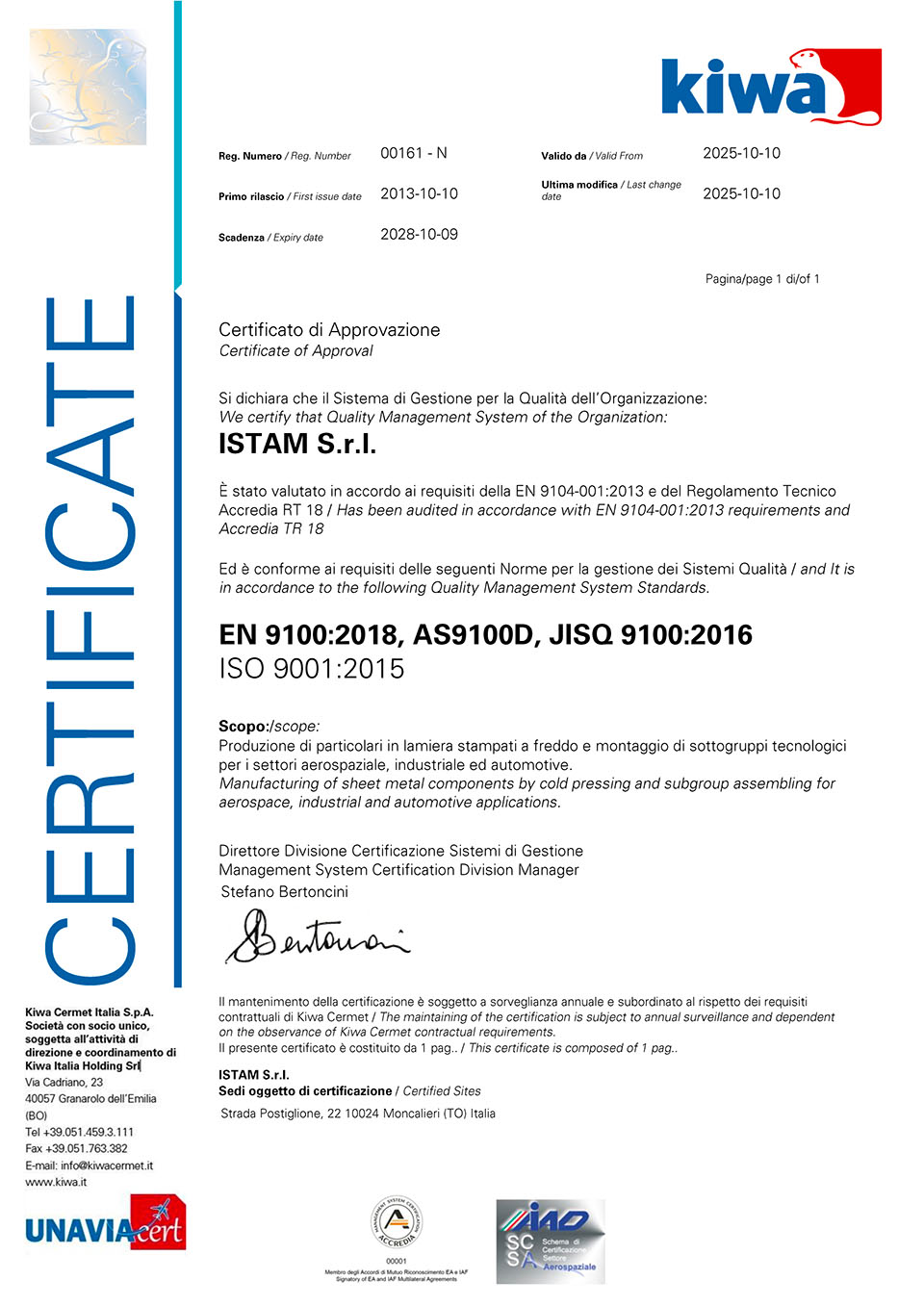Componentistica Certificata ISTAM. Certificazione ACCREDIA KIWA EN 9104-001-2013 per la sicurezza dei componenti e la produzione di particolari in lamiera stampati a freddo e montaggio sottogruppi tecnologici